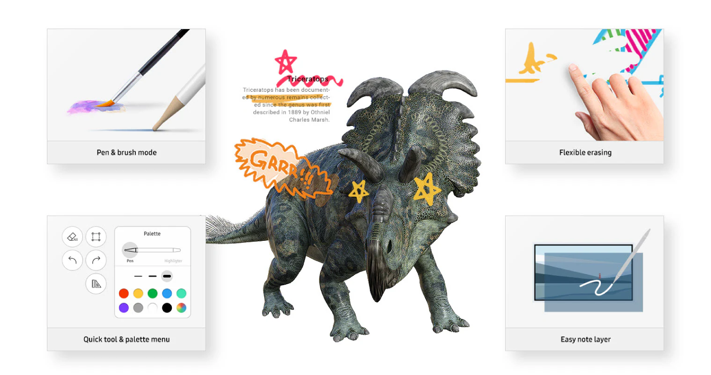 Ideas are brought to life instantly on Flip Pro with pen and brush mode that provides a real-world writing experience, while flexible erasing requires just a swipe of your finger or palm. The quick tool and palette menu ensure creativity flows and toggle button easily enables a new note layer UI.
