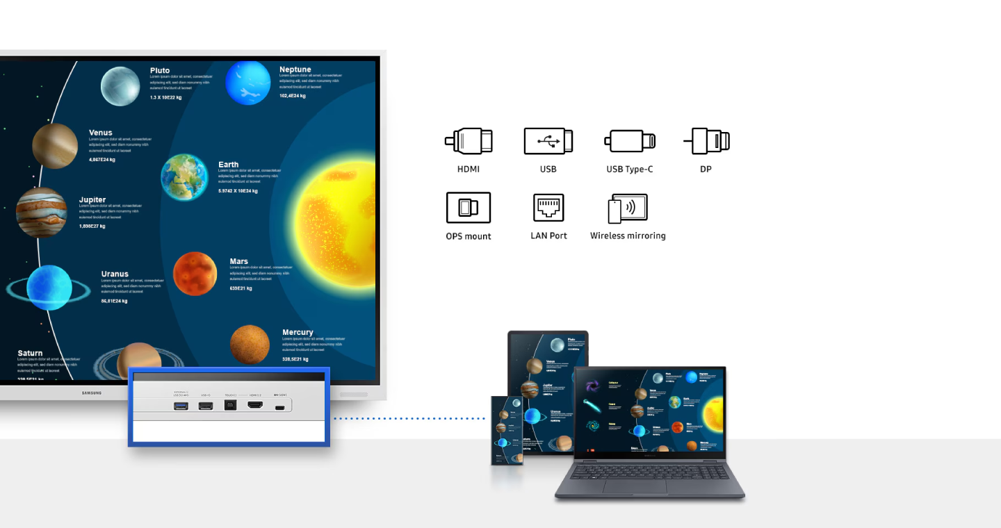 Flip Pro provides multiple connectivity options, including USB, HDMI, DP and OPS mount. Educators can easily connect any device to access content and display information on a larger screen, as well as connect to any network and other devices through LAN port and wireless screen-mirroring.