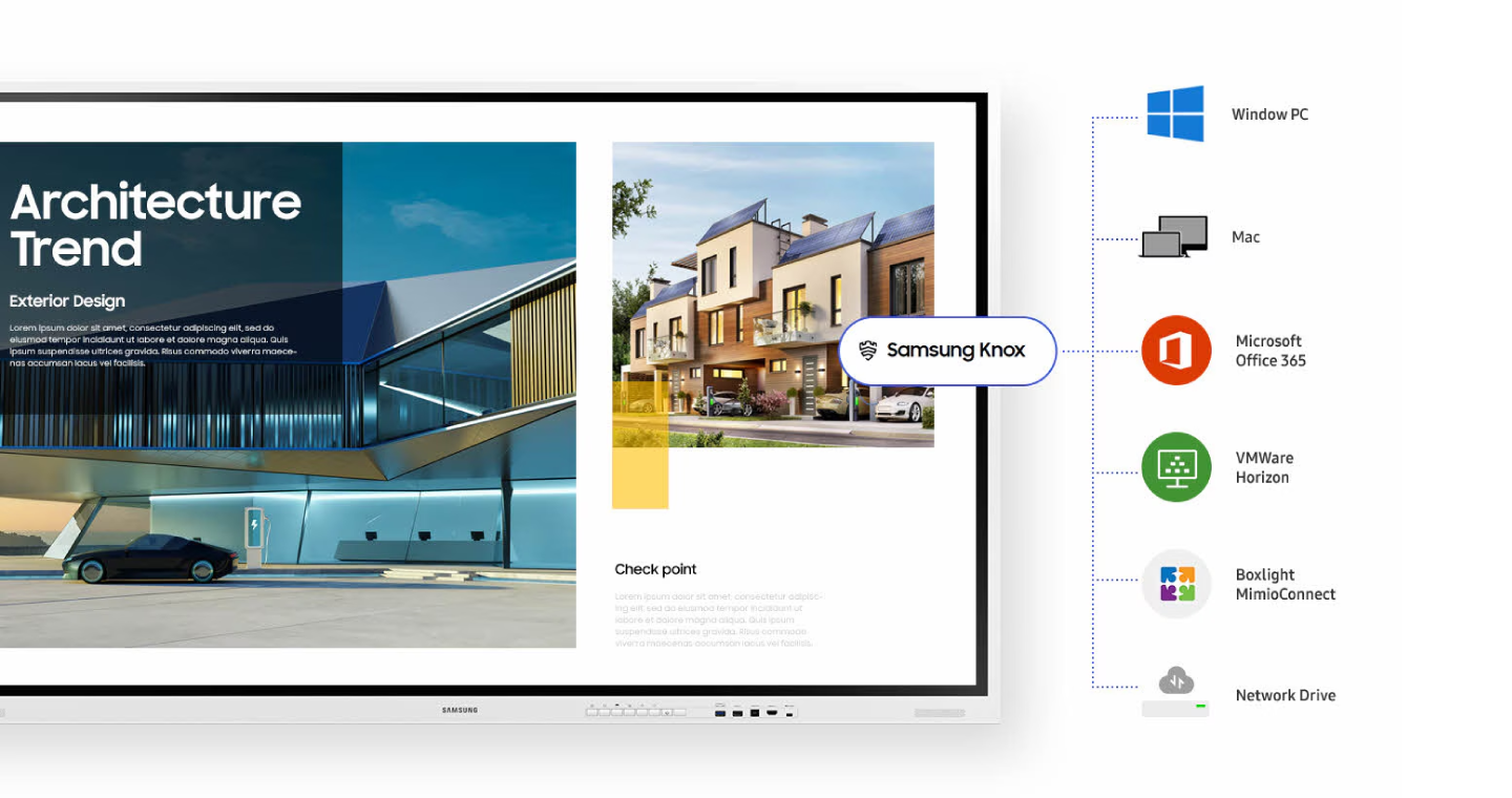 With Workspace secured by Knox, Flip Pro enables users to easily access remote PC, network drive and other third-party applications such as Office 365, VMWare, Boxlight MimioConnect. This ensures efficiency from any location and an uninterrupted workflow for educators and students.