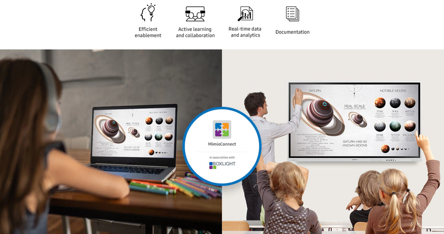 Flip Pro offers the MimioConnect app, an online blended learning platform, providing an extensive catalog of versatile learning content available via Workspace. Samsung’s partnership with leading US education solutions delivers innovative education software directly.