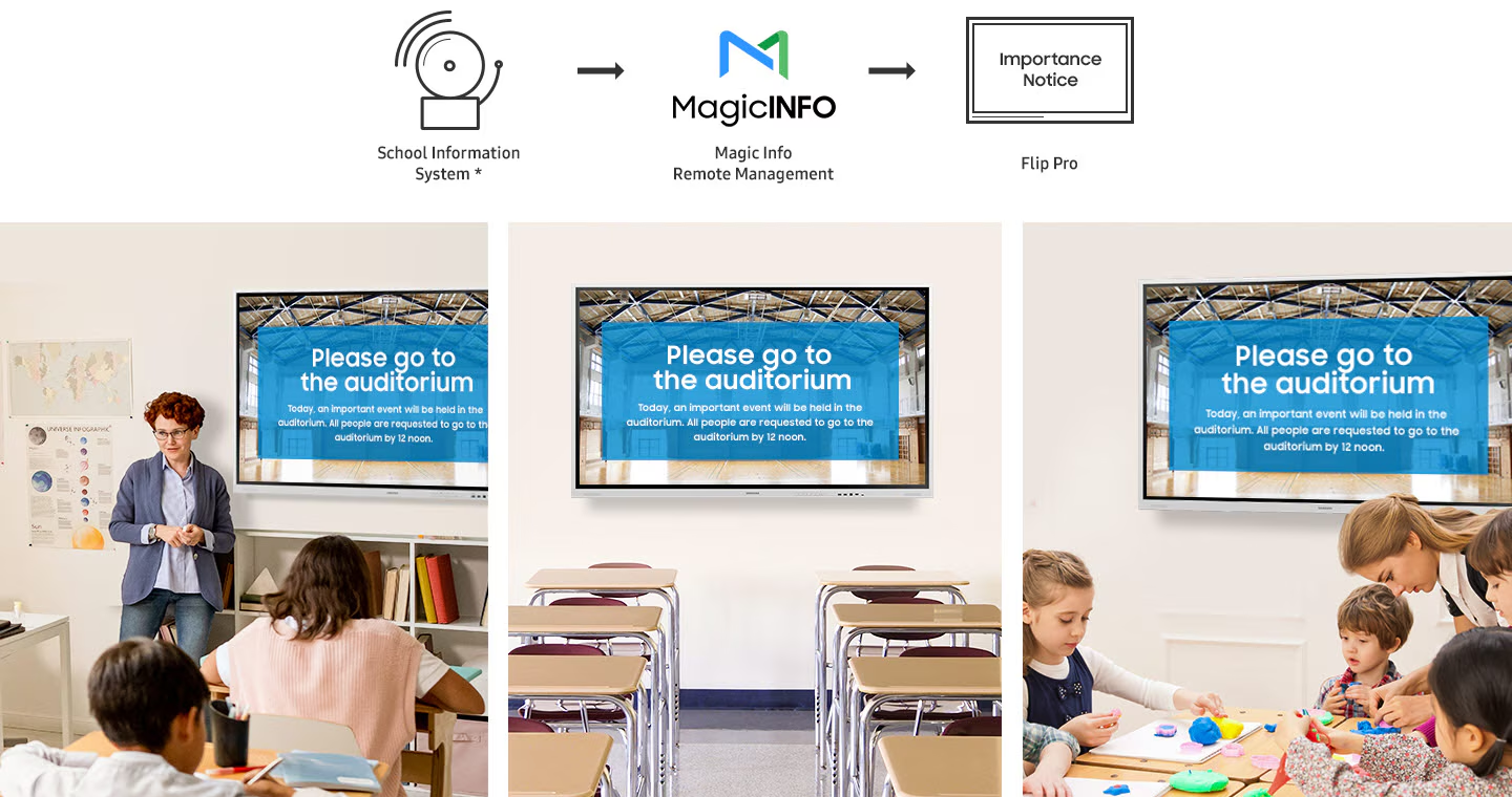 Using Samsung’s MagicINFO Remote Management solution, Flip Pro offers new functionality that pushes content, alerts and warnings from the school information system to the display, notifying teachers and students of important updates which can be pushed directly to Flip displays in every classroom.