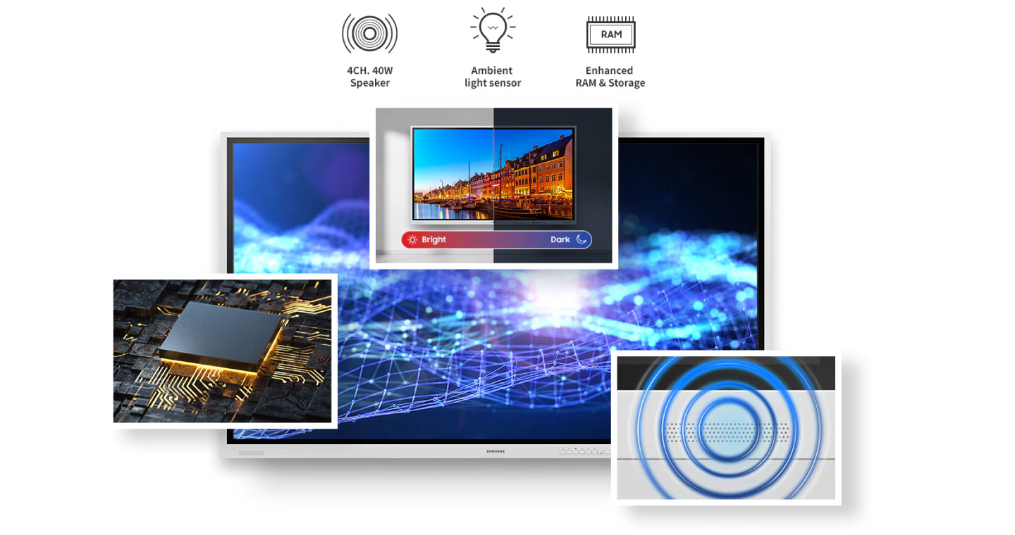 With a 4.0 Ch 40W speaker, made up of two front and back 10W speakers, Flip Pro ensures ample sound transmission. Plus, an ambient light sensor optimizes brightness according to external light conditions, while the Flip’s upgraded RAM (3.5G) and storage (32GB) delivers powerful SoC performance.