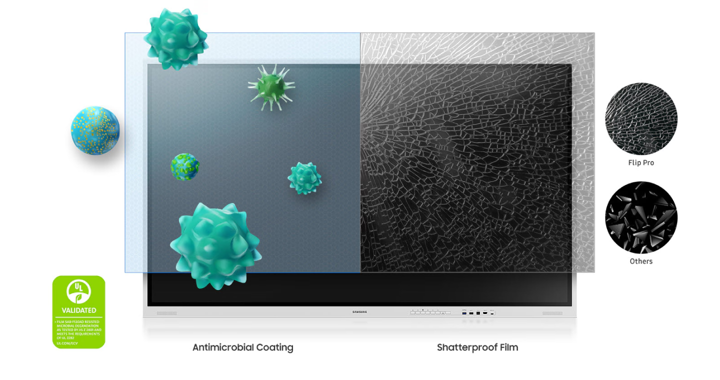 Samsung Flip Pro delivers peace of mind with a built-in Antimicrobial Coating which inhibits microbial growth. Plus, the Flip’s display is wrapped in a proprietary shatterproof film, ensuring the screen stays intact in the event of a break.